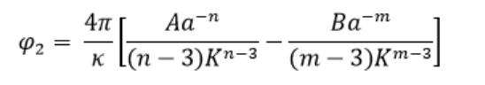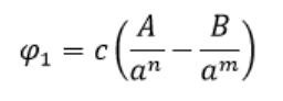 A, B, n, m, σ [Å] und ɛ aus ɛ/k [K] mit k, der Boltzmann Konstante sind Stoffkonstanten, r ist der Abstand beider Moleküle [Å]. φ ist das Energiepotenzial in den Einheiten von ɛ, d.h. J oder erg. Der Exponent m = 6 lässt sich nach Coulomb herleiten (Moelwyn-Hughes), der Exponent n = 12 ist empirisch. Die Koeffizienten σ [Å] und ɛ als ɛ/k [K] findet man u.a. in Poling, Prausnitz, sie lassen sich aber auch berechnen, wie nachstehend beschrieben ist.. σ ist der Abstand für φ = 0.